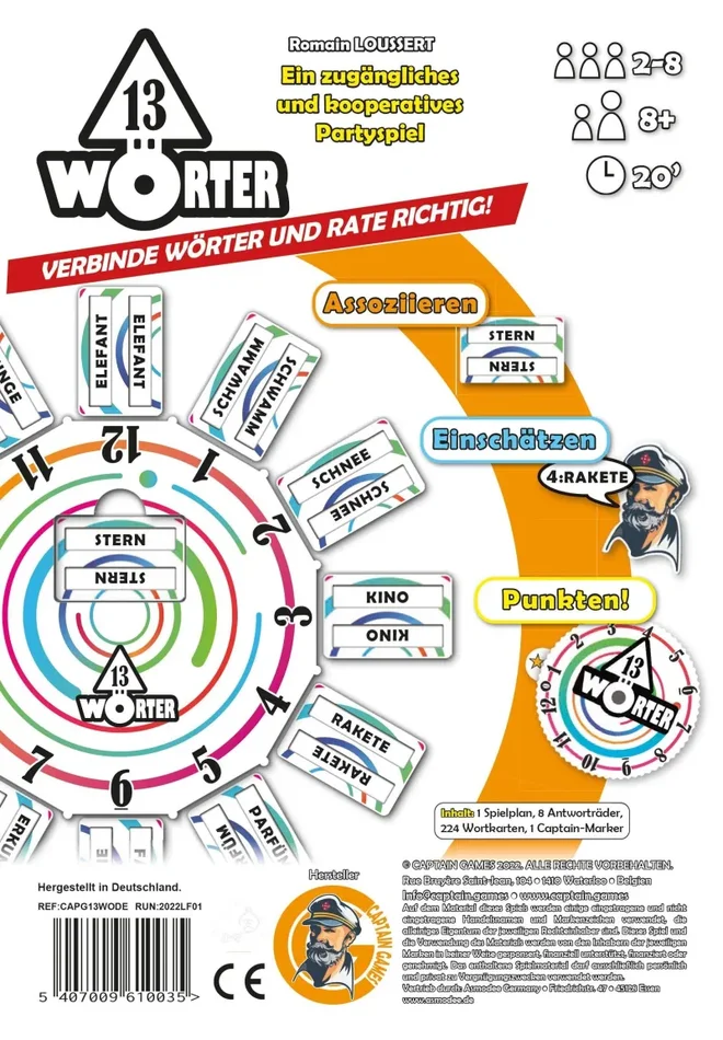 Der Captain assoziiert das Wort in der Mitte mit einem der zwölf ausliegenden Wörter und stellt sein Antwortrad verdeckt auf die entsprechende Zahl. Alle anderen drehen ebenfalls verdeckt an ihrem Antwortrad und markieren damit jeweils die Karte, von der sie glauben, dass der Captain sie ausgewählt hat. Wenn ihr euren Captain richtig eingeschätzt habt, bekommt ihr Punkte. Die Partie endet, sobald nur noch eine Karte außen am Spielplan liegt. Ihr habt die volle Punktzahl nicht erreicht? Gebt nicht auf, ihr werdet euch von Partie zu Partie verbessern.