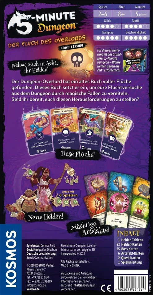 Gemeinsam gegen starke Endgegner – ein kooperatives Abenteuer wartet! In dieser Erweiterung zum Echtzeit-Spiel „5-Minute Dungeon“ hat der Overlord mächtig aufgerüstet. Jeder seiner Bosse hat neue Spielzeuge erhalten mit denen er den Helden das Leben schwer macht, allen voran die neuen Fluchkarten, die die Helden vor dauerhafte Probleme stellen. Doch auch die Helden haben neue Tricks im Ärmel: mächtige Artefakt-Karten unterstützen die Heldengruppe, die dank neuer Verbündeter nun auch zu sechst den Dungeon erobern können.