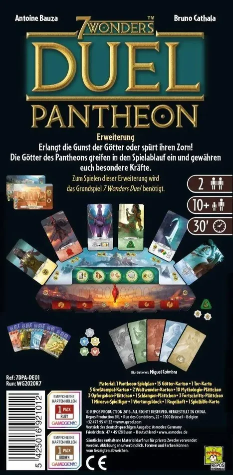 Die erste Erweiterung für 7 Wonders Duel fügt dem Spiel nun den Hauch des Göttlichen hinzu. Mit Pantheon können die Spieler nun bis zu fünf verschiedene Götter der Antike anrufen und als Schutzherren ihrer Städte einsetzen. Dabei bringt jede Gottheit unterschiedliche Vorteile, wie sagenhaften Reichtum, militärische Stärke oder auch die Möglichkeit die Pläne des Gegenspielers zu durchkreuzen. 7 Wonders Duel – Pantheon bringt neben den neuen Tempeln, die das dritte Zeitalter noch einmal besonders spannend machen, auch zwei neue Wunder mit ins Spiel, die durch das Anrufen der Götter ganz neue Wege zum Sieg bieten.