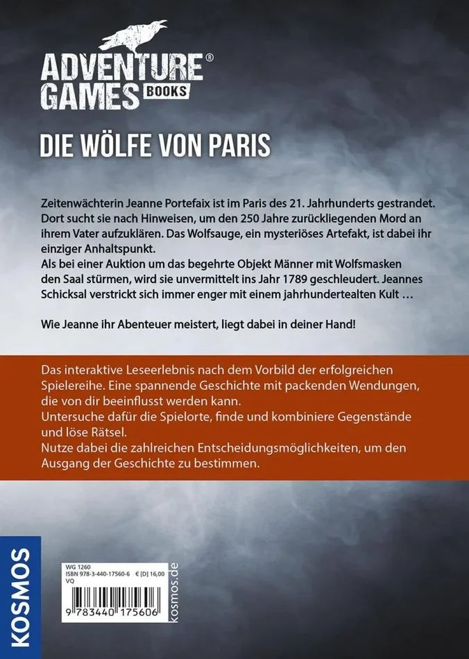Jeanne Portefaix auf gefährlicher Mission in Paris – 1789 und 2019. Ihre Akademie wurde zerstört und sie konnte ihre Ausbildung zur Zeitenwächterin nicht abschließen. Im 21. Jahrhundert will Jeanne endlich den Mord an ihrem Vater rächen. Als sie ein mysteriöses Wolfsauge-Artefakt bei einer Auktion im Louvre ersteigern will, greifen Männer mit Wolfsmasken an. Ein turbulentes Abenteuer, in dem viele weitere Geheimnisse auf Jeanne warten. Choose Your Own Adventure: Spielorte untersuchen, Rätsel lösen, Gegenstände finden und kombinieren. Es gibt mehr als 100 Entscheidungsmöglichkeiten, um den Ausgang der Geschichte zu beeinflussen. Ein interaktives Leseerlebnis!