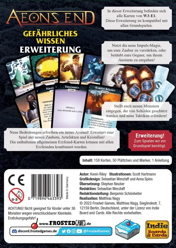 Gefährliches Wissen bringt euch neue Karten, mit denen ihr Aeon’s End erweitern könnt. Es enthält Zauber, Artefaktkarten und Kristalle für eure Vorräte sowie neue allgemeine Erzfeindkarten, die ihr mit allen Erzfeinden verwenden könnt.