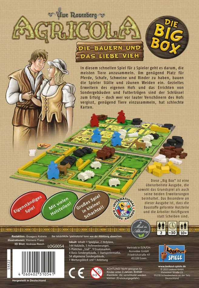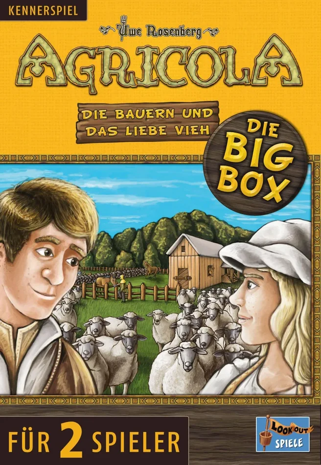 Agricola: Die Bauern und das liebe Vieh ist die Zwei-Spieler-Variante des Worker-Placement-Spiels Agricola und erschien ursprünglich im Jahre 2012. Bei der Big Box handelt es sich um eine überarbeitete Ausgabe, die sowohl das Grundspiel als auch beiden Erweiterungen beinhaltet. Das Besondere an dieser Ausgabe ist, dass die Baustoffe geformte Holzteile und die Arbeiter Holzfiguren statt Scheiben sind. An den Regeln hat sich nichts geändert, die Anleitung wurde allerdings neu verfasst und der ein oder andere Text auf den Sondergebäuden umformuliert.