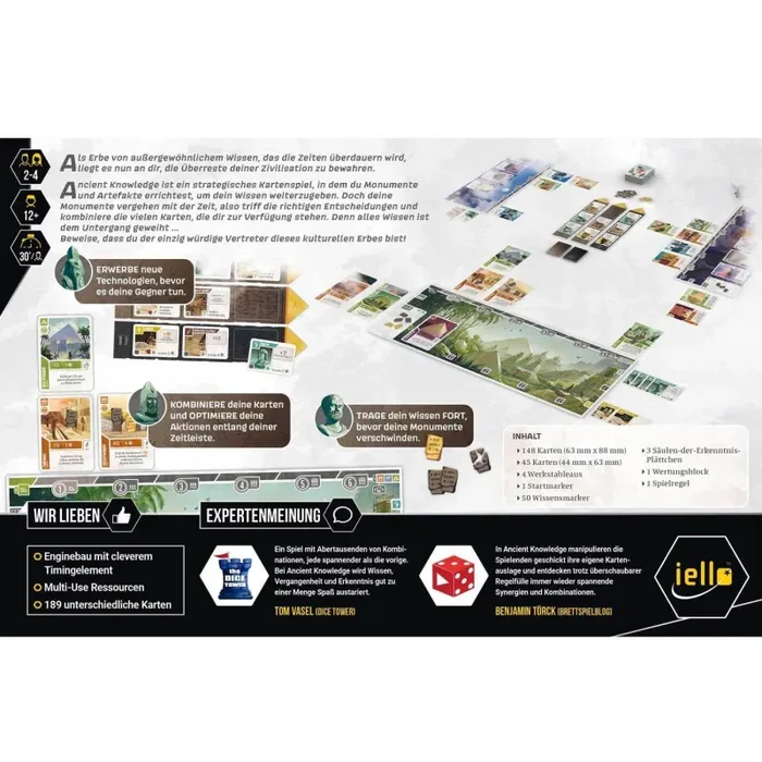 Als Erbe von außergewöhnlichem Wissen, das die Zeiten überdauern wird, liegt es nun an dir, die Überreste deiner Zivilisation zu bewahren. Ancient Knowledge ist ein strategisches Kartenspiel, in dem du Monumente und Artefakte errichtest, um dein Wissen weiterzugeben. Doch deine Monumente vergehen mit der Zeit, also triff die richtigen Entscheidungen und kombiniere die vielen Karten, die dir zur Verfügung stehen. Denn alles Wissen ist dem Untergang geweiht … Beweise, dass du der einzig würdige Vertreter dieses kulturellen Erbes bist!Enginebau mit cleverem TimingelementMulti-Use-Ressourcen189 unterschiedliche Karten