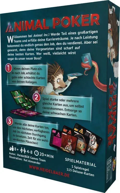 Animal Poker ist das tierisch gutes Kartenspiel rund um den nicht ganz so fairen Auf-und Abstieg im modernen Arbeitsleben. Werdet von jetzt auf gleich der neue Boss in Animal Inc. oder bleibt für immer der Praktikant.