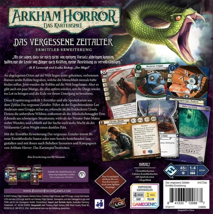 Die Ermittler-Erweiterung Das vergessene Zeitalter für Arkham Horror: Das Kartenspiel enthält fünf Ermittler und alle Spielerkarten aus dem Zyklus Das vergessene Zeitalter. Führt als der Expeditionsleiter Leo Anderson eure Gruppe sicher an; erforscht als die Entdeckerin Ursula Downs die unberührte Wildnis; entkommt als der Alkoholschmuggler Finn Edwards aus schwierigen Situationen; wirkt als der Priester Pater Mateo wahre Wunder; und schließt auf der Such nach mehr Macht als der Verdammte Calvin Wright einen dunklen Pakt.