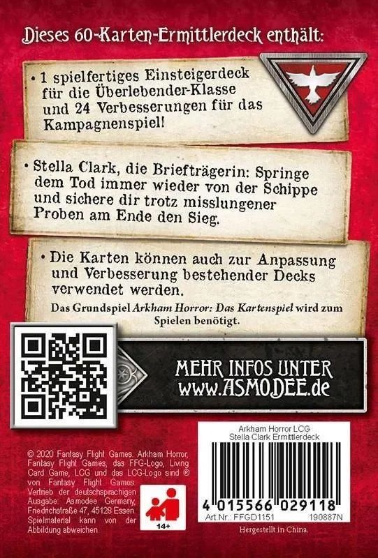 Enthalten sind ein spielfertiges Ermittlerdeck für die Überlebender-Klasse und 26 Verbesserungen für das Kampagnenspiel. Die Karten könnt ihr auch zur Anpassung und Verbesserung bestehender Decks verwenden. Zum Spielen braucht ihr ein Grundspiel Arkham Horror: Das Kartenspiel.