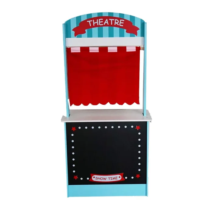 Keine Lust mehr auf Kaufladen? Nicht schlimm, dann dreht man den Stand um und hat ein wunderschönes Kasperletheater. Der Vorhang geht zum Hochrollen und unten ist wieder eine Tafel angebracht, auf der die Kinder z.B. den Titel des Märchens o.ä. schreiben können.