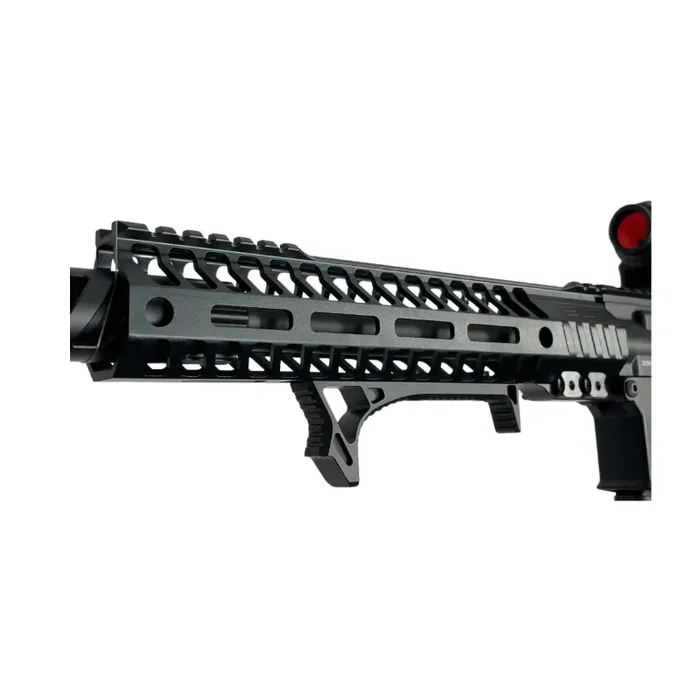 Vollständig Wettkampftauglich und mit einer Schussleistung von mehr als 320 Fuß pro Sekunde ist dieser Blaster kein Scherz, mit dem neuesten GBG Custom-Skelettschalldämpfer gepaart mit dem SLR-lizenzierten 10-Zoll-Handschutz ist dieser Blaster unübertroffen.