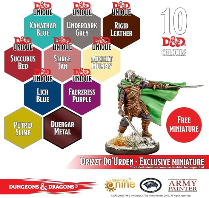 Als Fortsetzung des Erfolgs der zuvor veröffentlichten Dungeons & Dragons-Farbsätze enthält Nolzur’s Marvelous Pigments – Underdark Paint Set alles, was du brauchst, um die Bewohner des bösen Underdark zu bemalen. Die 10 enthaltenen Farben wurden speziell ausgewählt, um zu den Kreaturen und Rassen des Underdark zu passen, und beinhalten Farben wie „Faerzress Purple“, „Stirge Tan“ und „Duergar Metal“. Im Farbset enthalten ist eine limitierte Drizzt Do’Urdan Miniatur.