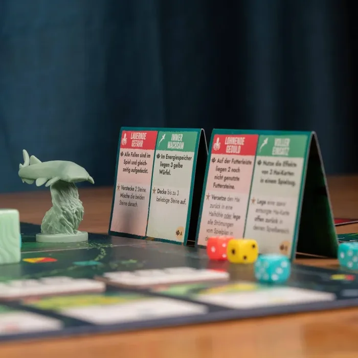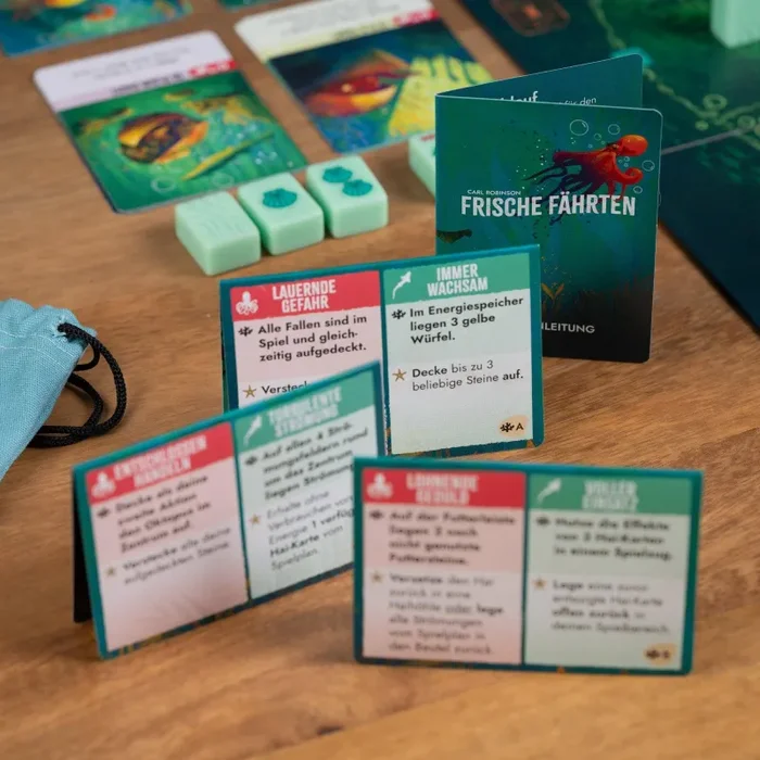 Frische Fährten ist eine Mini-Erweiterung für Kelp. Zielkarten verlangen jederzeit nach wichtigen strategischen Entscheidungen. Nur wer seine Ziele zuerst erreicht, erhält wertvolle Vorteile im Spiel.