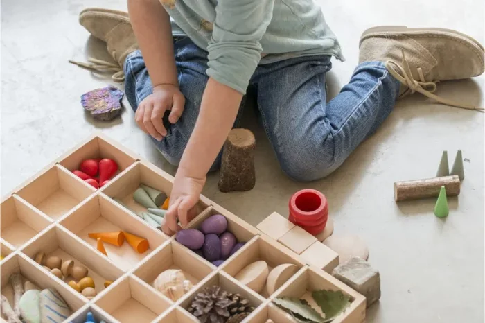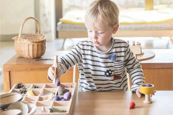 Ordnung und Ästhetik sind von grundlegender Bedeutung, weil ein gut organisiertes Material dazu beiträgt, Momente der Qualität und des spielerischen Lernens zu schaffen. Dieses Tablett mit Teilern ermöglicht es, eine Vielzahl von Materialien gleichzeitig anzubieten. Die Fächer helfen dabei, die Materialien zu ordnen und zu begrenzen, sodass die Kinder die kleinen Elemente sortieren und klassifizieren können – alles Teile ihrer Umwelt.