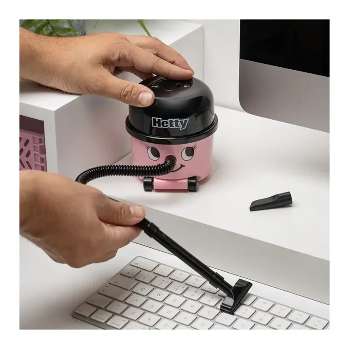 Sorge mit dem Hetty Desk Vacuum PC-Staubsauger in pink und schwarz für Ordnung auf deinem Schreibtisch – und das mit Stil! Der offiziell lizenzierte Mini-Staubsauger in witzigem Hetty-Design bringt nicht nur Funktionalität, sondern auch gute Laune an den Arbeitsplatz. Mit seiner kompakten Größe entfernt er im Nu Krümel, Staub und kleine Partikel und lässt sich dabei ganz einfach per Knopfdruck bedienen. Ein witziges Gadget, das als Geschenk bei Freunden, Kollegen, Schülern oder Studenten garantiert gut ankommt. Ob im Büro, an der Uni oder im Homeoffice – dieser kleine Helfer ist immer zur Stelle.