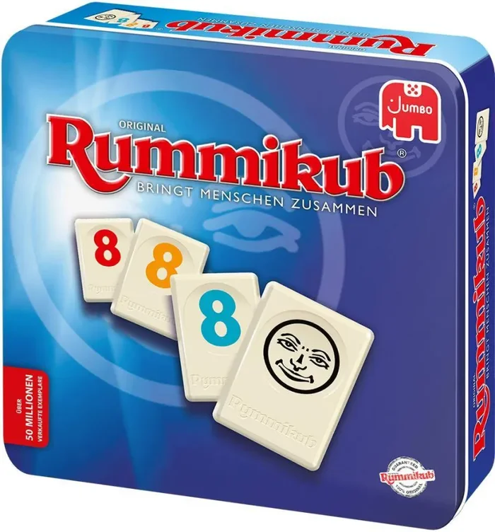 „Original Rummikub“ in einer dekorativen Metallverpackung. Und so funktioniert es: 1. Jeder Spieler bekommt verdeckt 14 Spielsteine von seinem linken Mitspieler. 2. Beim ersten Auslegen benötigt jeder Spieler 30 Punkte mit einer oder mehreren eigenen Serien von seinem Brett. 3. Nach der ersten Auslage besteht ein Zug immer aus einem von zwei Ereignissen. – Wer an der Reihe ist spielt mindestens einen Spielstein von seinem Ablagebrett aus. – Wer nicht auslegen kann oder möchte, muss einen Spielstein aus dem Pool ziehen. In beiden Fällen ist der Spielzug danach beendet und der nächste Spieler an der Reihe. 4. Wer als Erster alle seine Spielsteine abgelegt hat, gewinnt!