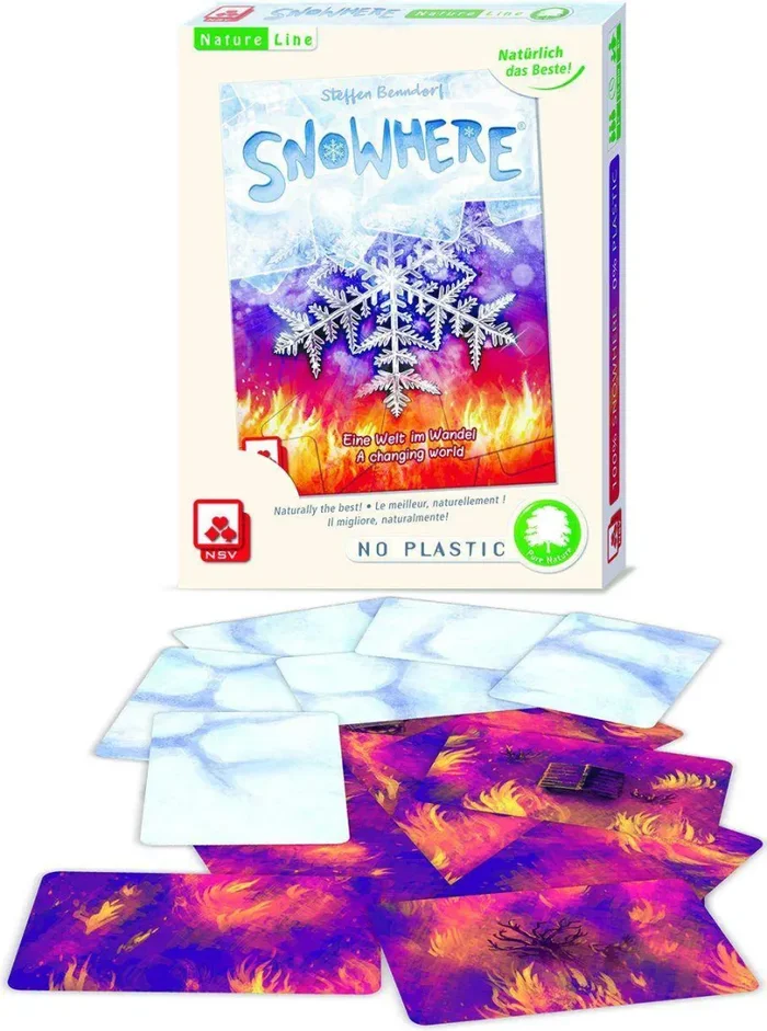 Im Spiel liegt ein Feuerteppich in Form eines zufällig verteilten Kartenhaufens aus. Einige der Karten liegen ganz oben, andere werden verdeckt. Die Karten die unbedeckt sind, können aufgenommen werden. Diese Karten dürfen nun auf die Rückseite gedreht und in Schnee verwandelt werden. Mit diesen Schneekarten können jetzt die noch ausliegenden Feuerkarten bedeckt und dadurch gelöscht werden. Aber aufgepasst! Jede aufgenommene Karte legt weitere Feuerkarten frei. Die abgelegten Schneekarten blockiert beim Löschen möglicherweise Feuerkarten.Wird es euch gelingen, die richtigen Karten zu wählen, um das Chaos aus Hitze und Flammen zu beseitigen?Sind alle verbliebenen Feuerkarten komplett mit Schnee bedeckt, ist SNOWHERE perfekt gelöst!