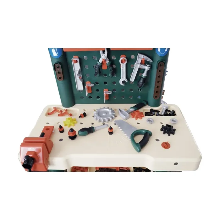 Hier kann man ordentlich schräubeln, sägen, feilen, hämmern u.v.m. Sogar eine Wasserwaage und ein cooler Schraubstock ist dabei.