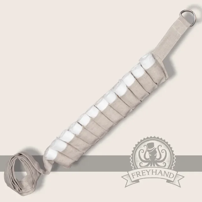Ein klassischer Schnell-zieh-Gürtel mit 12 Verbänden. Damit habt ihr eine ganze Menge Verbände jederzeit direkt griffbereit. Außerdem sieht man euch auch sofort an, dass ihr ein echter Profi seid, was die Wundversorgung angeht. Der Gurt wird mit einem Verschluss aus D-Ringen zusammen gezurrt und ist somit in der Größe Variabel einstellbar. Ihr könnt ihn entweder auf Hüfthöhe tragen oder auch schräg über die Schulter werfen. Ein nützliches Accessoire für jeden Heiler im LARP. Standardmäßig enthält der Gurt 12 Verbände aus dünner Gaze mit einer Länge von ca. 3 m.