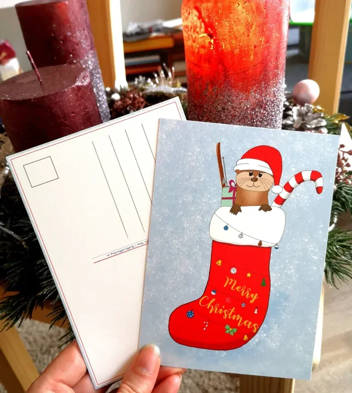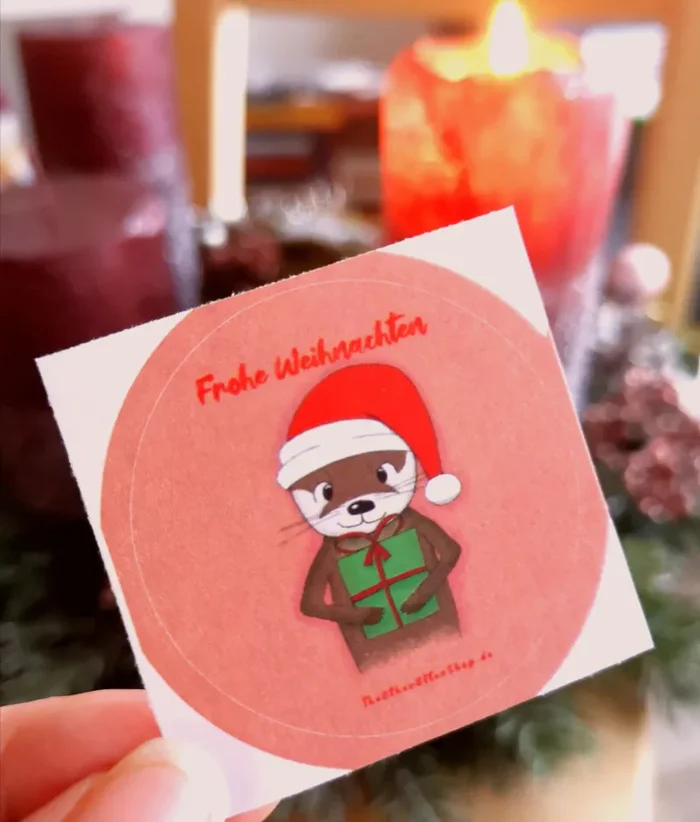 Die Weihnachtsotter-Karten können selbst gewählt werden. In jedem Paket befindet sich außerdem eine Frohe Weihnachten-Postkarte, die nicht konfigurierbar ist sowie 5 Frohe Weihnachten-Otter-Sticker.