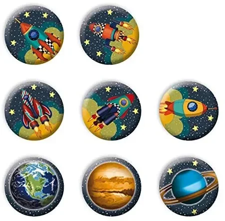 Tolles Mitgebsel auf dem Weltraumgeburtstag: Spannende Buttons zum Thema Weltraum und Planeten. Packung mit 8 Weltraum-Buttons, Durchmesser 2,5cm.