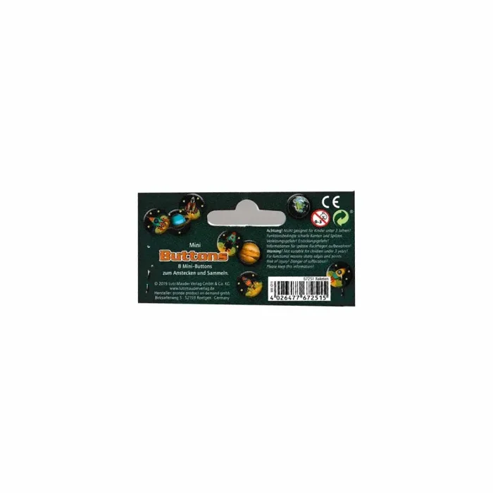 In der Packung befinden sich 8 verschiedene kleine Buttons mit Weltraummotiven. Sie sind ein sehr schönes Mitgebsel auf der Weltraumparty. Sie können angesteckt oder auch gesammt werden.