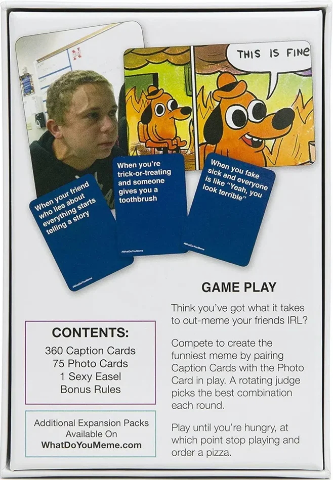 Think you’ve got what it takes to out-meme your friends IRL? Compete to create the funniest meme by pairing Caption Cards with the Photo Card in play. A rotating judge picks the best combination each round. Play until you’re hungry, at which point stop playing and order a pizza.
