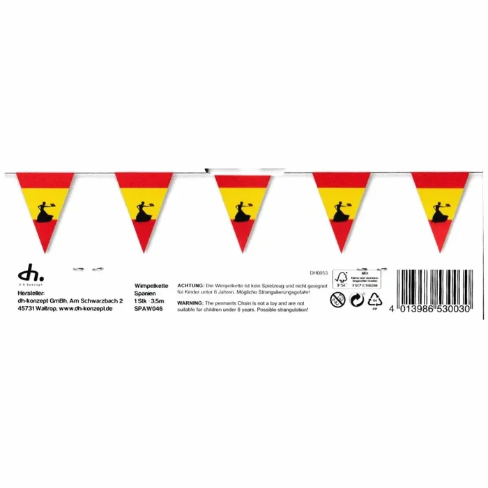 Girlande für die Spanien Dekoration. Die Spanien Girlande ist 3,5 m lang, beidseitig bedruckt. 10 Wimpel je 25 x 18 cm.