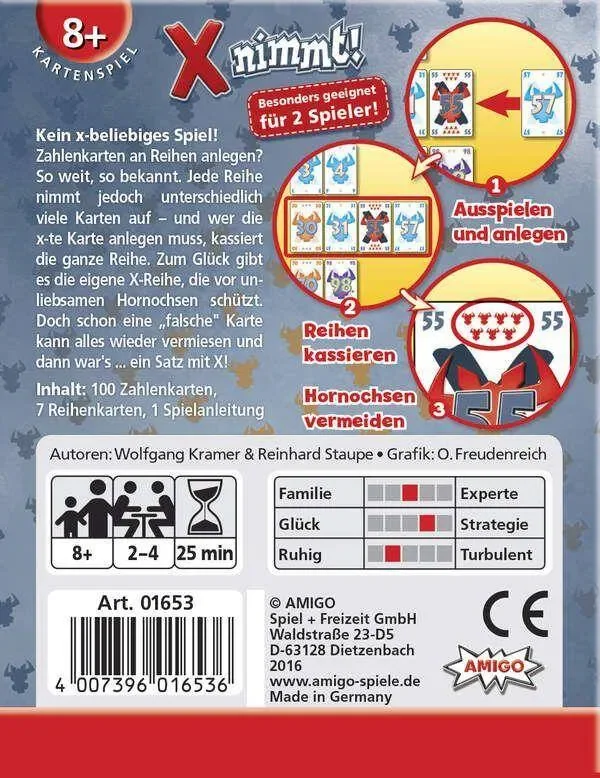 Zahlenkarten an Reihen anlegen? So weit, so bekannt. Jede Reihe nimmt jedoch unterschiedlich viele Karten auf und wer die x-te Karte anlegen muss, kassiert die ganze Reihe. Zum Glück gibt es die eigene X-Reihe, die vor unliebsamen Hornochsen schützt. Doch schon eine falsche Karte kann alles wieder vermiesen und dann wars … ein Satz mit X!