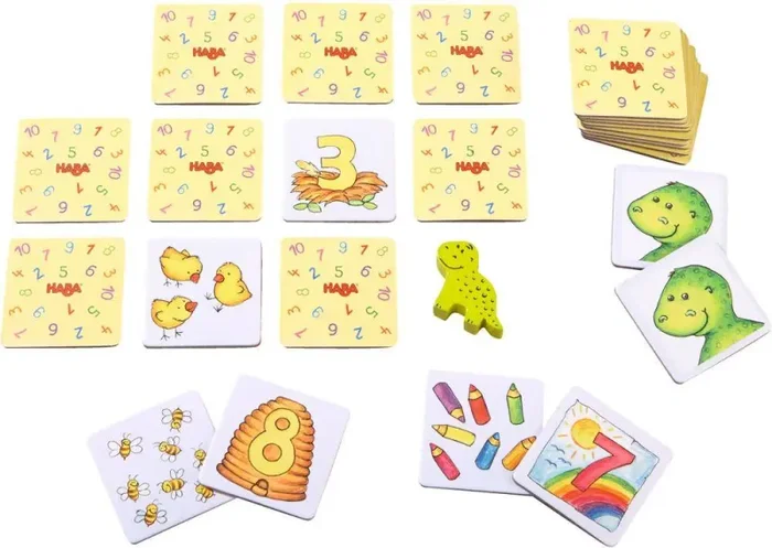 1, 2, 3 … Wer kann dem Zahlendino beim Zählen helfen? Mit diesem dinostarken Zahlen- und Memospiel können bis zu vier Kinder von drei bis acht Jahren spielerisch den Zahlenraum von 1 bis 10 entdecken. Zu jeder Karte mit einer Ziffer muss die Karte mit der passenden Menge gefunden werden. Sie lernen so nicht nur das Lesen von Zahlen, sondern auch das Erkennen von Mengen. Die Bilder auf den Karten helfen dabei: Die Symbole auf den Zahlen- und Mengenkarten gehören immer zusammen. Und außerdem gibt es noch den lustigen Zahlendino. Wer den am Schluss hat, dem hilft er beim Gewinnen.