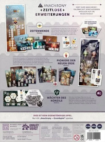 Zeitenwende Modul: Experimentiere mit dem Raum-Zeit-Kontinuum und manipuliere den Zeitpunkt des Einschlags zu deinem Vorteil. Dieses Modul führt ein subtiles semi-kooperatives Element ein, mit dem der Einschlag sogar ganz verhindert werden kannPioniere der neuen Erde-Modul: Rüste deine Exosuits mit Ressourcen und Durchbrüchen auf, um sie auf gefährliche Expeditionen ins Hinterland zu schicken! Mit genügend Vorbereitung und ein wenig Glück kannst du die Geheimnisse der Vergangenheit enthüllen, feindselige Lebensformen bekämpfen, geheime Technologien und mehr finden.Wächter des Konziels-Modul: Wirb die mächtigen Wächter an und vergrößere deine Armee aus Exosuits! Die Wächter können von jedem Pfad angeheuert werden. Sie funktionieren ohne Arbeiter und gelten auf Aktions-Feldern immer als Genies